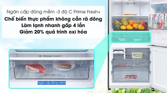 Tủ lạnh ngăn đông mềm của Panasonic được thiết kế với ngăn chứa thực phẩm đông mềm, được gọi là Prime Fresh+. Ngăn này giữ cho thực phẩm luôn tươi ngon và đảm bảo giữ được độ mềm của chúng. Với tủ lạnh này, bạn có thể tiết kiệm thời gian và dễ dàng chuẩn bị các món ăn hấp dẫn.