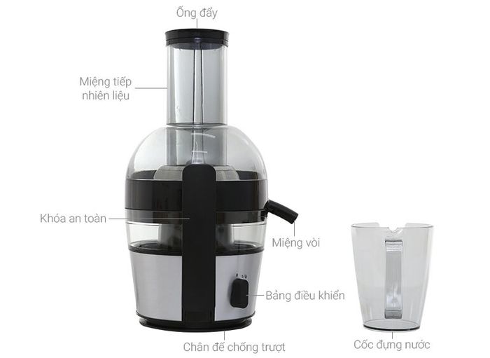 Máy ép hoa quả Philips HR1836 đi kèm với cốc đựng nước bằng nhựa an toàn, không mùi, đựng đủ nước cho 1-2 người dùng. Ống tiếp nguyên liệu rộng giúp xay ép mà không cần thái nhỏ thực phẩm.