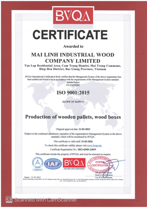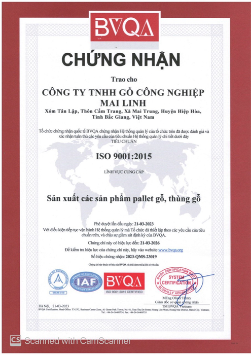 Công Ty TNHH Gỗ Công Nghiệp Mai Linh, với trụ sở chính tại Thôn Cẩm Trang, Xã Mai Trung, Huyện Hiệp Hòa, Bắc Giang, là đơn vị hàng đầu cung cấp các giải pháp đóng gói an toàn cho hàng hóa của quý khách hàng khỏi các tác động của môi trường, sự va đập trong quá trình vận chuyển, xuất khẩu, và lưu kho. Chúng tôi tự hào mang đến sản phẩm và dịch vụ chất lượng cao, bao gồm: ✲ Pallet gỗ dán ✲ Pallet gỗ keo ✲ Pallet thùng gỗ ✲ Đóng mới pallet gỗ ✲ Pallet gỗ xuất khẩu ✲ Pallet thùng gỗ dán ✲ Pallet thùng ván ép ✲ Đóng pallet mặt liền ✲ Đóng pallet gỗ chịu tải ✲ Pallet gỗ 2 hướng nâng ✲ Pallet gỗ 4 hướng nâng ✲ Đóng pallet theo yêu cầu ✲ Đóng pallet gỗ dán mặt liền ✲ Đóng pallet gỗ chân cục gỗ dán ✲ Pallet gỗ đóng mới theo bản vẽ ✲ Pallet gỗ đóng mới theo yêu cầu ✲ Đóng pallet gỗ cho hàng siêu trọng ✲ Đóng pallet gỗ cho hàng siêu trường ✲ Đóng pallet gỗ keo chân cục mặt thưa ✲ Thùng gỗ dán ✲ Thùng gỗ pallet ✲ Thùng ván ép ✲ Thùng gỗ đa năng ✲ Thùng gỗ pallet kín ✲ Thùng gỗ ván thưa ✲ Đóng thùng gỗ dán ✲ Đóng thùng gỗ kín ✲ Kiện gỗ nan thưa ✲ Thùng gỗ 4 mặt nâng ✲ Thùng gỗ pallet thưa ✲ Kiện gỗ hút chân không ✲ Kiện gỗ máy phát điện ✲ Thùng gỗ công nghiệp ✲ Thùng gỗ pallet hở mặt ✲ Đóng kiện gỗ xuất khẩu ✲ Đóng thùng gỗ dạng nan ✲ Đóng thùng gỗ xuất khẩu ✲ Kiện gỗ đóng hàng dễ vỡ ✲ Kiện gỗ máy nông nghiệp ✲ Thùng gỗ pallet đựng trái cây ✲ Thùng gỗ pallet trang trí ✲ Đóng kiện gỗ theo yêu cầu ✲ Kiện gỗ đóng hàng điện tử ✲ Đóng thùng gỗ chuyển hàng ✲ Thùng gỗ cho hàng máy móc ✲ Dịch vụ đóng thùng gỗ pallet ✲ Thùng gỗ đóng kín bằng ván ép ✲ Đóng thùng gỗ cho hàng siêu trường ✲ Dịch vụ đóng thùng gỗ ✲ Dịch vụ đóng kiện gỗ kín ✲ Dịch vụ đóng kiện gỗ thưa ✲ Đóng gói hàng hóa xuất khẩu ✲ Đóng gói hàng hóa theo tiêu chuẩn ✲ Dịch vụ đóng gói hàng hóa điện tử ✲ Dịch vụ đóng gói hàng hóa dễ vỡ ✲ Dịch vụ đóng gói thiết bị văn phòng ✲ Dịch vụ đóng kiện gỗ cho máy móc ✲ Đóng gói hàng hóa có hút chân không ✲ Đóng gói hàng hóa theo yêu cầu ✲ Lashing cont hàng hóa ✲ Dịch vụ lashing hàng hóa ✲ Lashing hàng hóa quá khổ ✲ Dịch vụ lashing hàng hóa container ✲ Cố định hàng hóa quá khổ trên container Với quy trình sản xuất đạt tiêu chuẩn quốc tế ISO 9001:2015, chúng tôi cam kết mang đến sự tận tâm, tôn trọng, tin cậy và chuyên nghiệp trong mọi dịch vụ. Chúng tôi vinh dự là đối tác đóng gói hàng hóa hàng đầu của các tập đoàn lớn như Samsung, HANARO, và nhiều công ty tại KCN phía Bắc. Với 20 năm kinh nghiệm hoạt động và đội ngũ từ 51 - 100 nhân viên, chúng tôi luôn nỗ lực không ngừng để cung cấp các giải pháp đóng gói và vận chuyển hiệu quả, bảo vệ hàng hóa của khách hàng với chi phí thấp nhất. Chúng tôi rất hân hạnh được phục vụ quý khách!