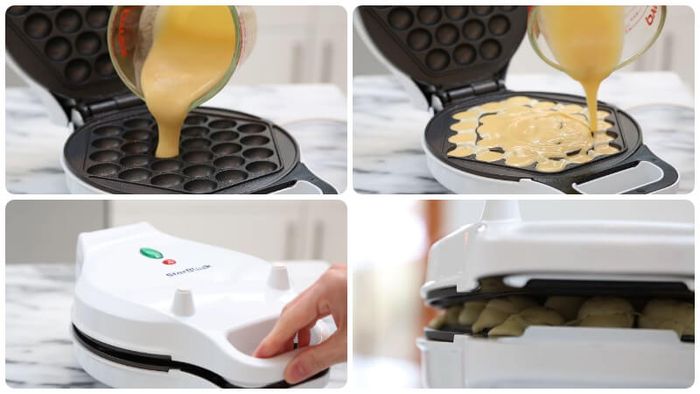 - Đổ từ từ hỗn hợp bột vào các ô của máy nướng, đảm bảo đều và không quá đầy để tránh tràn bột ra ngoài.