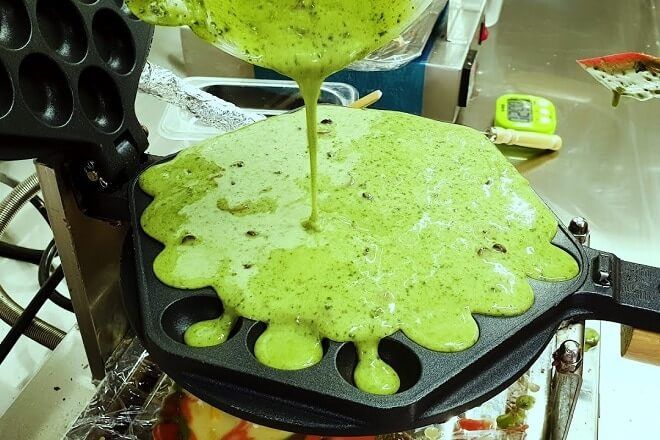 - Phết dầu thực vật lên máy nướng, sau đó đổ bột vào máy.