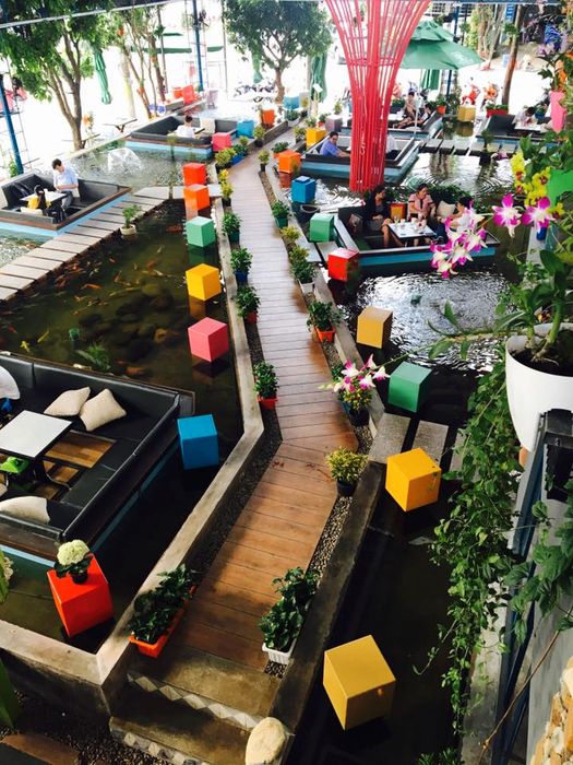 Oasis Cafe với không gian rộng, được bài trí đẹp mắt hài hòa giữa nước, cây cỏ, và hồ nước cùng đàn cá bơi lượn xung quanh.