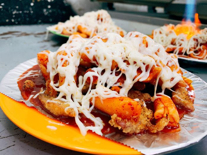 Đến đây, thưởng thức món gà cay phô mai hấp dẫn. Một đĩa gà cay sốt phô mai chỉ với 60K, đầy ắp. Nhìn tổng thể, màu đỏ cam của nước sốt cay phối hợp với màu trắng sữa của phô mai tan chảy tạo hiệu ứng thị giác “nhìn thôi đã thèm”. Hơn thế nữa, quán rất hào phóng khi cho phô mai ngập tràn, làm cho đĩa gà thêm phần hấp dẫn.
