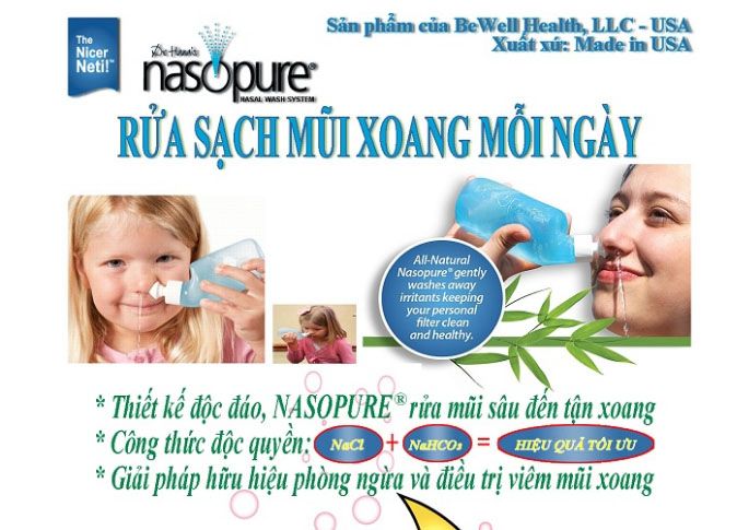 Dụng cụ rửa mũi Nasopure được sản xuất trên công nghệ của Mỹ. Đã được FDA Mỹ chứng nhận an toàn cho trẻ nhỏ. Bình được thiết kế giúp rửa sạch xoang mũi, phòng tránh và hỗ trợ điều trị xoang mũi, viêm mũi, ngạt mũi, sổ mũi một cách hiệu quả nhất. Bình được thiết kế với áp lực chuẩn, rửa 1 chiều giúp ngăn chặn vi khuẩn quay ngược trở lại. Trên thân bình có đánh vạch chỉ mực nước rõ giàng, giúp người dùng dễ xác định mực nước.