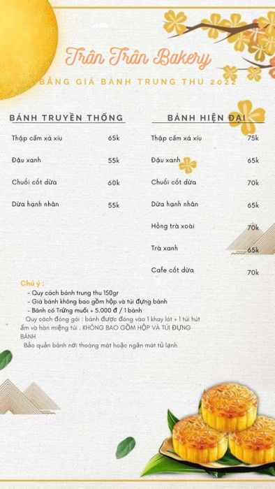 Tiệm Bánh Thơ Ngọt phục vụ hai loại bánh trung thu độc đáo, là bánh trung thu truyền thống và bánh trung thu hiện đại, đáp ứng sở thích của cả người lớn và trẻ em. Lớp vỏ bánh mềm mịn, có màu vàng sậm đẹp mắt cùng lớp nhân bên trong tròn vị khiến bạn không thể chỉ ăn một miếng. Bánh trung thu truyền thống có nhân thập cẩm xá xíu, đậu xanh, chuối cốt dừa và hạnh nhân. Nếu bạn muốn thử sức với vị mới, hãy lựa chọn bánh trung thu hiện đại với các nhân hấp dẫn như hồng trà xoài, trà xanh và cà phê cốt dừa. Quy trình sản xuất tại đây được đảm bảo vệ sinh an toàn thực phẩm, nguyên vật liệu có nguồn gốc rõ ràng để khách hàng có thể yên tâm lựa chọn.