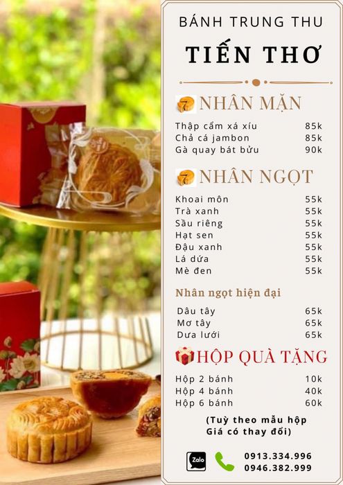 Nhà Hàng Tiến Thơ có đội ngũ đầu bếp chuyên nghiệp, giàu kinh nghiệm, sáng tạo ra những chiếc bánh trung thu thơm ngon, hấp dẫn đến từng hương vị. Nhà hàng cung cấp nhiều sự lựa chọn phù hợp, từ bánh trung thu nhân mặn, ngọt đến bánh trung thu chay. Lớp vỏ bên ngoài thơm ngon hòa quyện với nhân bên trong, kết hợp nguyên liệu như xá xíu, jambon, hạt sen, mè đen, khoai môn, dâu tây, nhân chay... tạo nên hương vị độc đáo. Bạn có thể lựa chọn từ nhiều kích cỡ và loại nhân khác nhau, cùng nhiều set quà tặng hấp dẫn.