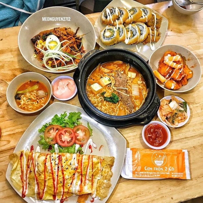 Phong cách của Cơm trộn 2 cô: Đa dạng và phong phú, Cơm trộn 2 cô không chỉ nổi danh với món cơm trộn hấp dẫn mà còn thu hút thực khách bởi món kimbap chiên xù ngon tuyệt, ăn kèm với sốt Mayonnaise hấp dẫn. Không gian quán thoải mái, là điểm hẹn lý tưởng cho các bạn trẻ tụ tập, liên hoan, hoặc tổ chức sinh nhật… Giá cả phải chăng, dao động từ 60.000-100.000 đồng/người. Địa chỉ: Lê Văn Sỹ, quận Tân Bình.