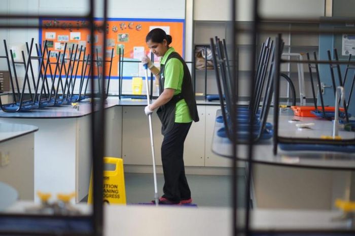 - Classroom cleaning: sweeping floors, mopping, wiping desks and chairs, cleaning walls, shelves, cabinets, doors, emptying trash bins, and tidying up.