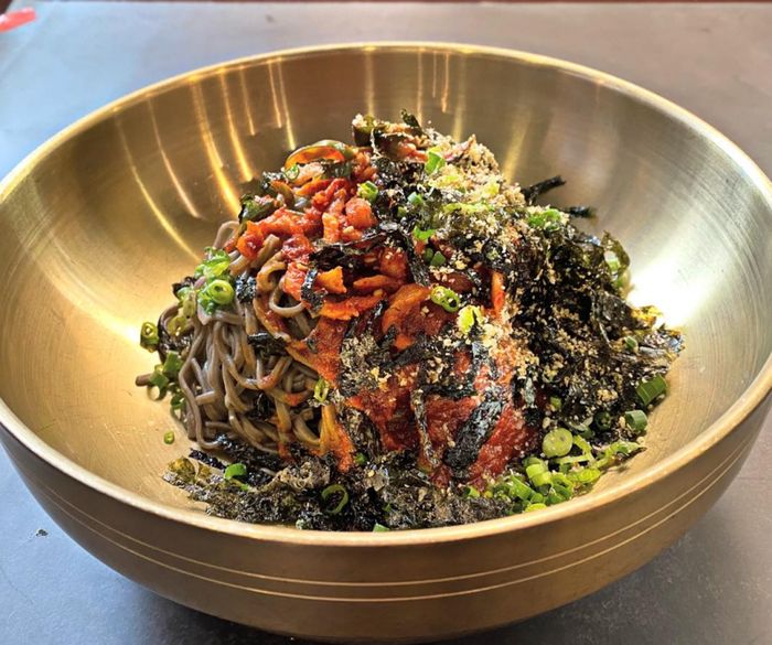 Mì trộn cay với phục vụ trong tô kim loại lớn, hòa quyện dưa chuột, củ cải, và lê thái lát, kết hợp thịt bò và trứng lộc, tạo nên bức tranh mắt đẹp. Mì lạnh mang hương nồng, vị thanh thanh và mát lạnh. Tô mì trộn thường đi kèm với nước xốt cay, tạo điểm nhấn màu sắc cho hương vị đặc trưng. Thêm vài viên đá vào tô để giảm bớt nhiệt độ mùa hè. Không gian của Shin BBQ thoáng đãng, không bị ngột ngạt mùi chiên hoặc nướng. Shin BBQ mang đến sự lựa chọn đa dạng như mì trộn, ca cao dầm, chân gà sả tắc, mẹt thức ăn nhanh,...