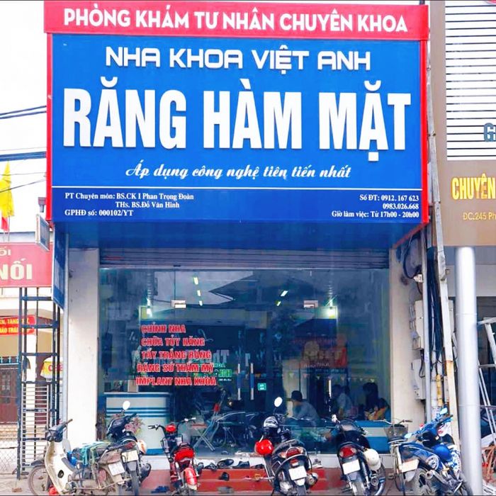 Nha khoa Quang TùngNha khoa Việt AnhNha khoa Việt Anh là địa chỉ nha khoa uy tín tại Hưng Yên, đặc biệt về dịch vụ niềng răng mắc cài sứ dây trong, được thành lập năm 2016 bởi bác sĩ Phan Trọng Đoàn. Phòng khám được trang bị đầy đủ các trang thiết bị nha khoa hiện đại, nhập khẩu từ các nước tiên tiến như Đức, Mỹ, Nhật Bản. Các bác sĩ tại phòng khám đều được đào tạo chuyên sâu, có tay nghề cao và luôn tận tâm với bệnh nhân. Phòng khám sử dụng các trang thiết bị nha khoa hiện đại, nhập khẩu từ các nước tiên tiến như Đức, Mỹ, Nhật Bản. Các bác sĩ tại phòng khám đều được đào tạo chuyên sâu, có tay nghề cao và luôn tận tâm với bệnh nhân.