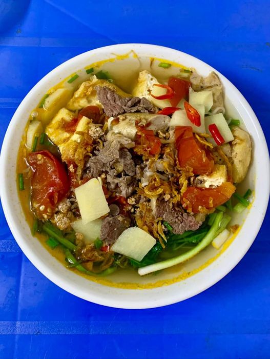 Một điểm đặc biệt của quán là măng ngâm - giòn, cay, chua chua, tạo điểm nhấn cho tô bún thêm phần ngon miệng. Bên cạnh đó, bát bún vừa phải, thêm miếng chả sụn, vài miếng bò nhúng, rau sống, đậu chiên béo bùi, và hành phi vàng rụm là những yếu tố tạo nên sự hấp dẫn cho tô bún riêu tại đây.