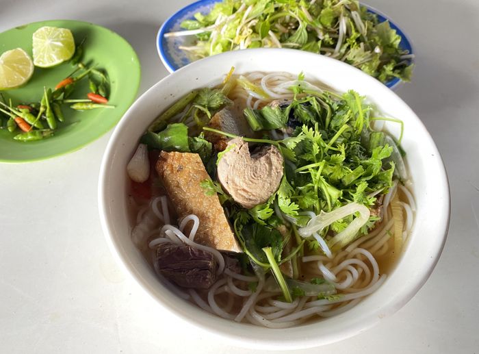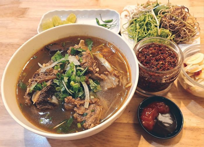 Nước dùng tại đây được hầm chế biến tỉ mỉ, không sử dụng gia vị bột ngọt, mà vẫn giữ được vị ngon tự nhiên từ xương hầm. Loại bún sợi to được sử dụng theo tiêu chuẩn của bún bò Huế, mang lại sự ngon miệng và độ giòn ngon cho thực khách. Bạn có thể trộn đều bún với ớt chua, rau sống để có một trải nghiệm ẩm thực hoàn hảo.