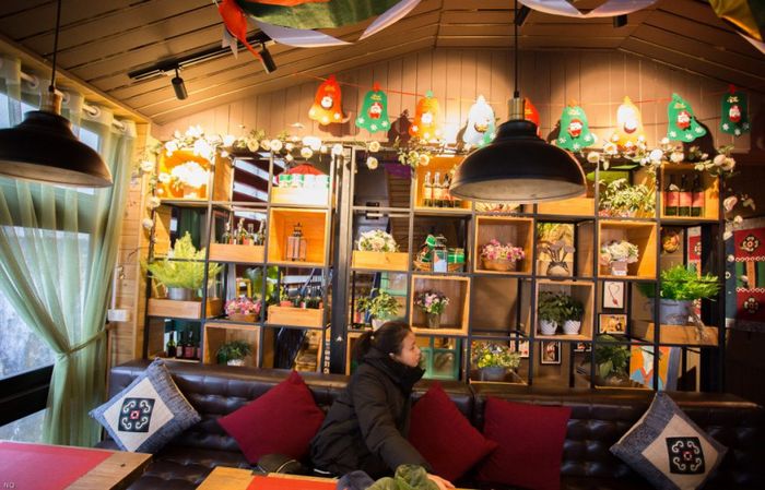 Bên ngoài quán lấp lánh với màu vàng của sơn, cánh cửa gỗ màu xanh như ngôi nhà Hội An, cùng với những chiếc đèn lồng và nhiều chậu cây xanh. Nhưng khi bước vào bên trong, Du Sole Sapa Cafe vẫn giữ được nét văn hóa Tây Bắc qua từng món đồ trang trí như khung ảnh, vải thổ cẩm, tranh,...