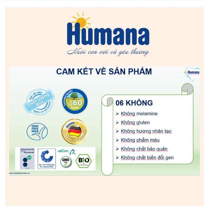 Sữa bột Humana Đức được sản xuất bởi tập đoàn Humana – một trong những tập đoàn hàng đầu tại Đức và là một trong những thương hiệu lớn nhất ở Châu Âu. Humana Milk được sản xuất hoàn toàn tại Đức trên quy trình nghiêm ngặt từ sữa bò được thu hoạch tại các trang trại xanh và sạch, bò được nuôi hoàn toàn bằng thức ăn tự nhiên, không có thành phần biến đổi gen GMO, Đảm bảo 5 không: Không sử dụng chất bảo quản; Không có phẩm màu; Không có hương vị nhân tạo; Không chứa gluten; Không có Melami.