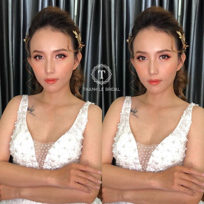 - - Thanh Lê Make Up mang đến phong cách trang điểm nhẹ nhàng và tinh tế với lớp nền mỏng mịn, giúp cô dâu tỏa sáng một cách tự nhiên và che khuyết điểm hiệu quả.