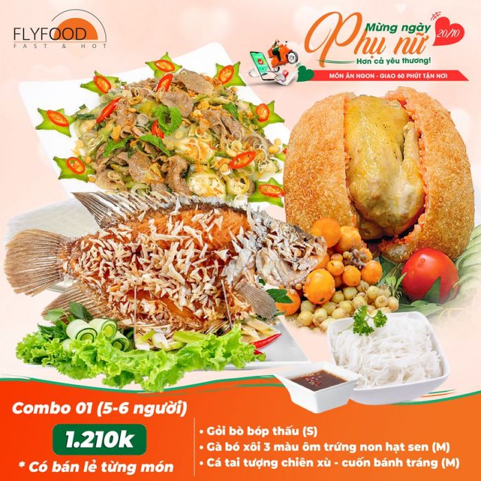Flyfood là dịch vụ nhận đặt tiệc nhanh tại nhà giá rẻ và uy tín của Tp HCM. Đây là dịch vụ chuyên đảm nhận đặt tiệc như nấu cỗ cúng, sinh nhật, thôi nôi, tân gia, đãi khách... với cam kết giá thành hợp lí, uy tín, chất lượng. Các món ăn ở đây phong phú, với gần 100 món ăn từ Á Âu cho đến các món ăn truyền thống và dịch vụ này lập sẵn một danh mục với 15 menu bàn tiệc cùng giá cả cho khách hàng lựa chọn.