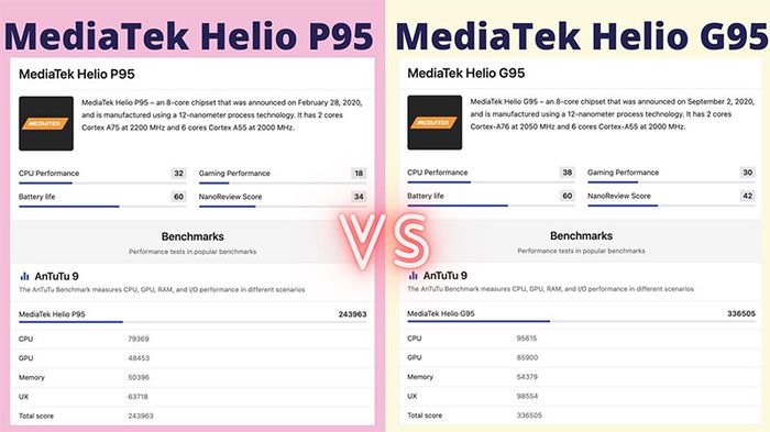 MediaTek Helio G95 nổi bật hơn so với P95 khi chơi game với hiệu suất nhanh hơn và chụp ảnh đa camera tiên tiến, tích hợp bộ xử lý trí tuệ nhân tạo. Cả hai đều có hiệu năng xử lý tốt, đảm bảo các tác vụ trên điện thoại diễn ra mượt mà và thời lượng pin lâu.