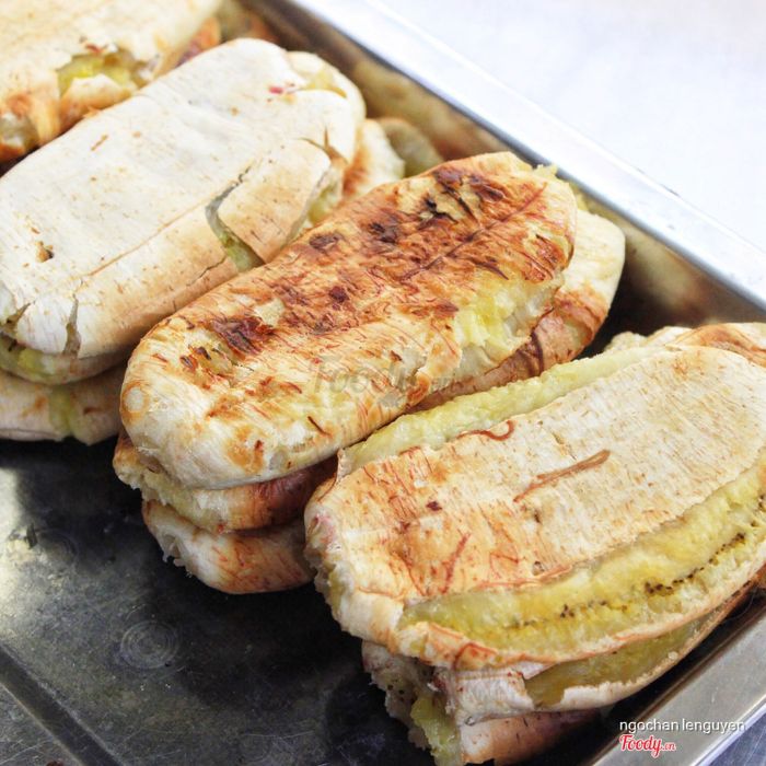 Chuối nướng với cốt dừa và hành tạo hương vị đặc biệt. Chuối nguyên trái sau khi nướng giòn ngoài lớp vỏ, cắt nhỏ và chan cùng cốt dừa/hành, thưởng thức ngay.