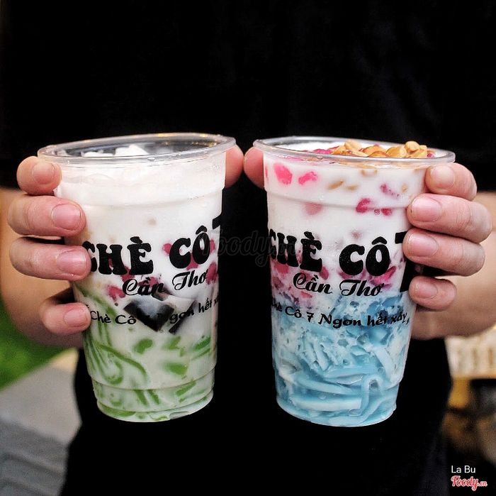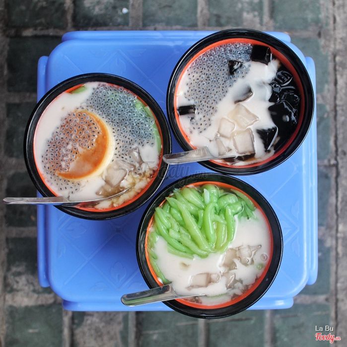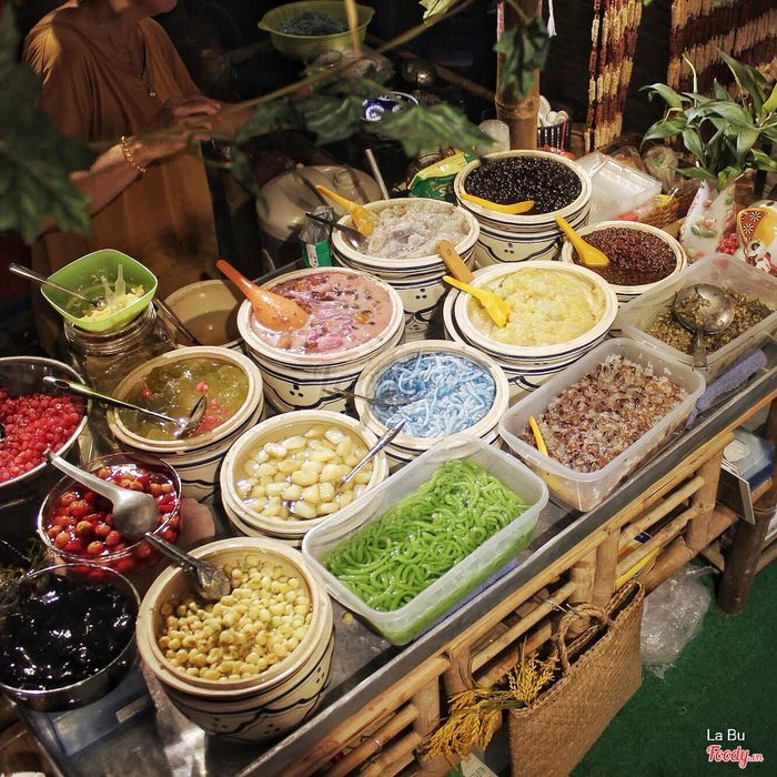 Quầy chè đa dạng khiến bạn muốn thử hết, từ truyền thống đến hiện đại, đủ loại chè từ trôi nước, đậu xanh, đậu nếp, cocktail, chè bưởi, chè bà bà... Đặc biệt là chè sợi dừa non xanh từ hoa đậu biếc, kèm hạt lựu và nước dừa tươi thơm.