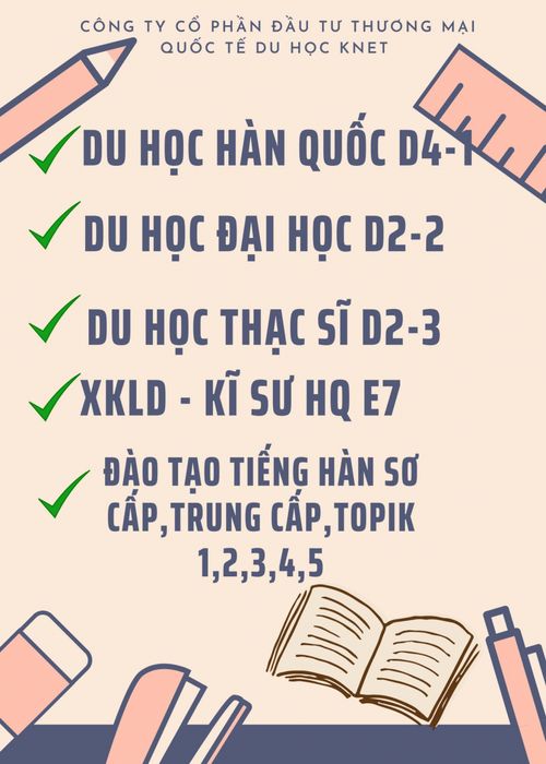 Chuyên tư vấn du học, hỗ trợ học viên chuẩn bị hồ sơ du học, đăng ký khóa học và xử lý thủ tục visa, Trung tâm học ngoại ngữ và du học KNET - Bình Định không chỉ là nơi cung cấp kiến thức ngôn ngữ mà còn tạo điều kiện cho sự phát triển cá nhân của sinh viên. Khóa học tiếng Hàn tại đây được thiết kế linh hoạt từ cơ bản đến nâng cao, giúp cải thiện kỹ năng ngôn ngữ và giao tiếp một cách toàn diện. Đội ngũ giáo viên giàu kinh nghiệm và phương pháp giảng dạy hiện đại đảm bảo chất lượng giảng dạy cao.