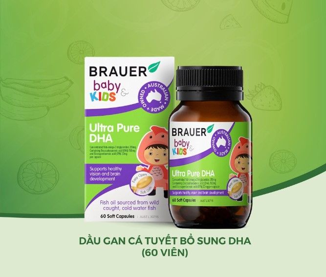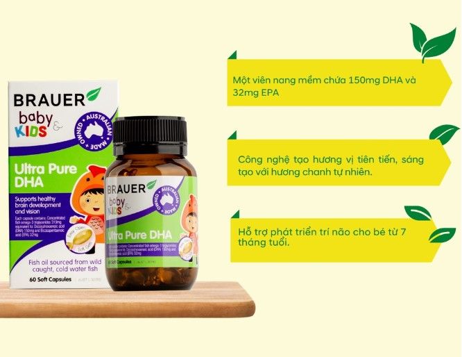 - Omega 3 triglycerides từ dầu cá cô đặc, Docosahexaenoic acid (DHA), Elicosapentaenoic acid (EPA). Với công thức cải tiến vượt trội, Brauer Baby & Kids Ultra Pure DHA cung cấp cho bé lượng DHA cần thiết và tăng cường khả năng hấp thụ.