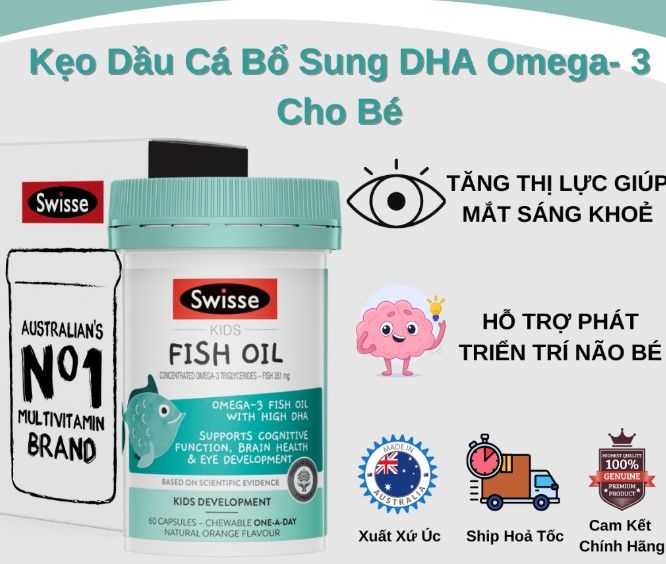 Dầu cá Swisse Kids Fish Oil bổ sung DHA, EPA cho trẻ, khuyến khích phát triển não, hỗ trợ sức khỏe tim mạch, miễn dịch, và làm giảm mỡ máu.