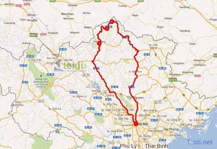 1. Hà Nội – Sơn Tây (theo đường 21) – Cầu Trung Hà – Cổ Tiết – Cầu Phong Châu – Phú Thọ - Đoan Hùng – Tuyên Quang - (quốc lộ 2) - Hàm Yên - Bắc Quang – Vị Xuyên – thành phố Hà Giang.