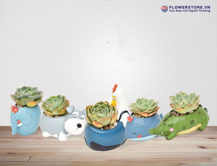 Một số loại cây được yêu thích tại Flowerstore: Cây lưỡi hổ, sen đá khổng lồ, hay các chậu Sen đá Ruby dễ thương trồng trong chậu hình thú cưng như cún con, gà trống hay cá voi, là những sản phẩm được dân văn phòng, học sinh và sinh viên ưa chuộng.