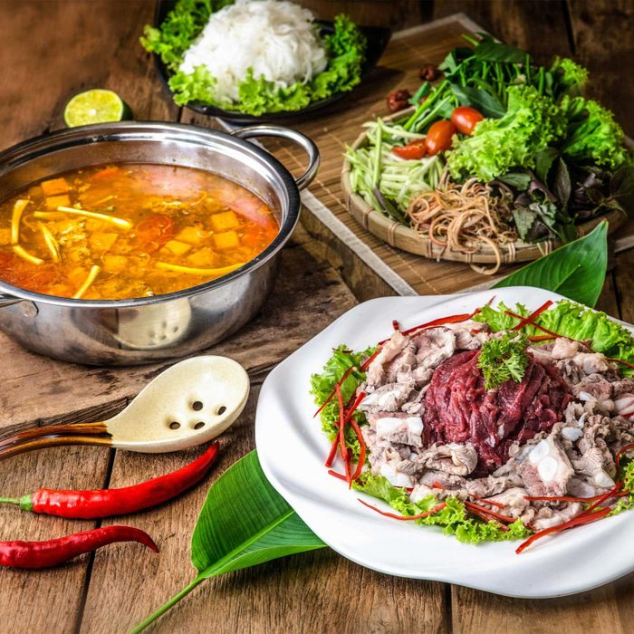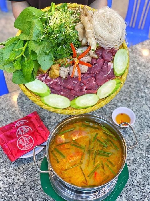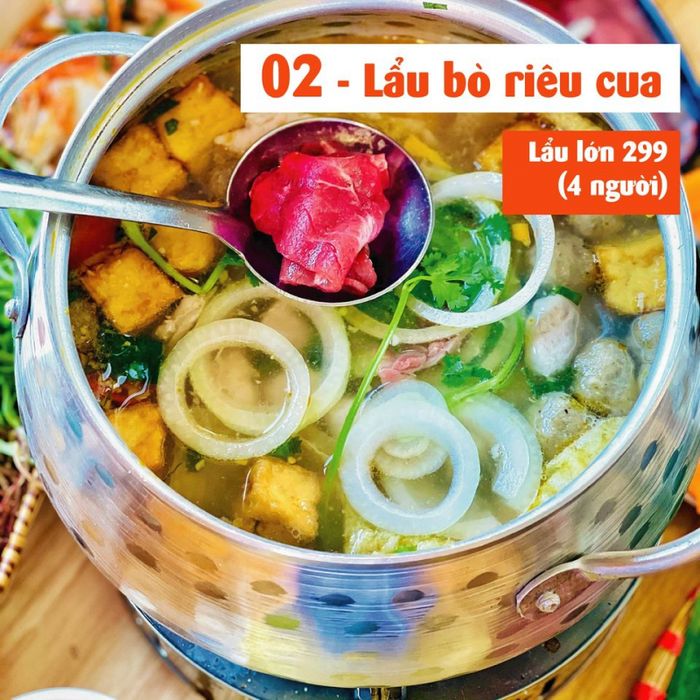 Khách đã ăn lẩu bò riêu cua của quán Bò Nằm Nhúng luôn ấn tượng bởi phần nước lẩu thanh ngọt từ rau củ càng tăng thêm hương vị nhờ thăn bò Úc, bò viên, riêu cua nhà làm, đậu hũ, mộc, mắm tôm. Lẩu sẽ bao gồm bún tươi, rau các loại, đối với nhóm đông khách có thể gọi theo combo từ 299.000 nghìn là có thể thưởng thức một nồi lẩu ngon. Các topping nhúng lẩu sẽ được bày trí trên một mẹt tre đúng chuẩn miền quê dân dã, lên hình cũng rất xinh. Khi thưởng thức, bạn sẽ cảm nhận được bò thì mềm không dai, tôm, cua đồng tươi đậm đà rất hợp với nước lẩu nhẹ nhàng.