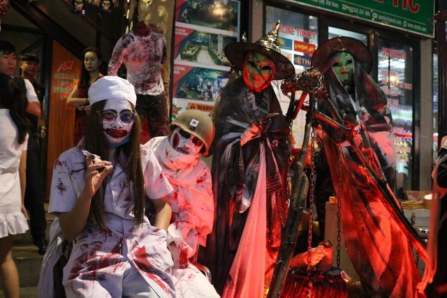 Đêm 31/10, nhiều phố Tây của Huế như Phạm Ngũ Lão, Võ Thị Sáu,… dường như trở thành một “Thế giới Halloween” thu nhỏ khi tràn ngập những hình ảnh quen thuộc như quả bí ngô, bộ xương, hình nộm ma quỷ,…cùng những điệu nhạc ma quái, rùng rợn. Các hàng quán ven đường rất chú ý đến ngày lễ này khi ngoài trang trí cho cửa hàng ngập tràn phong cách ma quái, kì dị thì còn bán những set đồ ăn dành riêng cho Hallowee, hay bán các phụ kiện hóa trang, móc khóa bí ngô, mũ phù thủy vô cùng đa dạng phong phú.