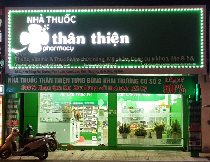 Nhà thuốc Thân Thiện là địa chỉ đáng tin cậy của cộng đồng, một thương hiệu được nhiều người ưa chuộng trong lĩnh vực dược phẩm tại thủ đô Hà Nội. Từ khi khai trương cho đến nay, Nhà thuốc Thân Thiện không ngừng nỗ lực để trở thành hệ thống nhà thuốc tiêu biểu nhất. Nhà thuốc Thân Thiện tuân thủ đúng chuẩn GPP (Good Pharmacy Practice - Thực hành tốt quản lý nhà thuốc) theo tiêu chuẩn của Cục quản lý dược (Bộ Y tế), luôn đặt chất lượng lên hàng đầu. Ngoài chi nhánh tại Số 10 ngõ 68/39, đường Cầu Giấy, quận Cầu Giấy, Hà Nội, Nhà thuốc Thân Thiện đã mở thêm cơ sở mới tại Số 30, Đồng Riu, Cựu Quán, Đức Thượng, Hoài Đức, Hà Nội để đáp ứng nhu cầu chăm sóc sức khỏe ngày càng cao của cộng đồng.