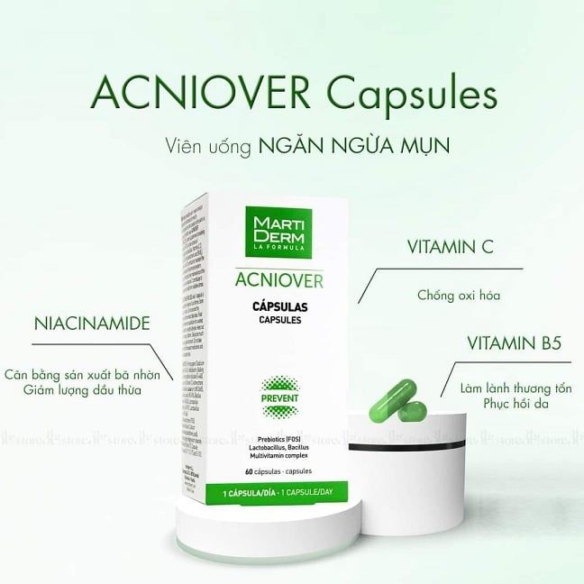 Viên uống ngăn ngừa mụn MartiDerm Acniover Capsules giúp ngăn ngừa mụn bùng phát trên làn da dễ nổi mụn. Công thức sản phẩm bao gồm các lợi khuẩn Prebiotics & Probiotics, kết hợp cùng Niacinamide, Vitamin C & D... nhằm hỗ trợ cân bằng lại hệ vi khuẩn đường ruột đang mất cân bằng do sử dụng thuốc uống điều trị mụn trong thời gian dài, giúp ổn định làn da từ ngay bên trong, đồng thời cũng là bước đầu tiên giúp ngăn ngừa mụn bùng phát.