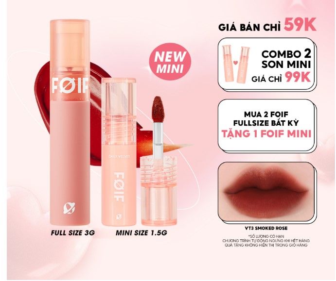 Dòng son dưới 150.000 đồng Mytour muốn giới thiệu: son kem lì thuần chay, mịn mượt lâu trôi Foif Daily Velvet Tint. Chất son mịn, màu sắc đa dạng, giúp đôi môi luôn xinh đẹp, hứa hẹn làm mê đắm giới trẻ yêu làm đẹp.
