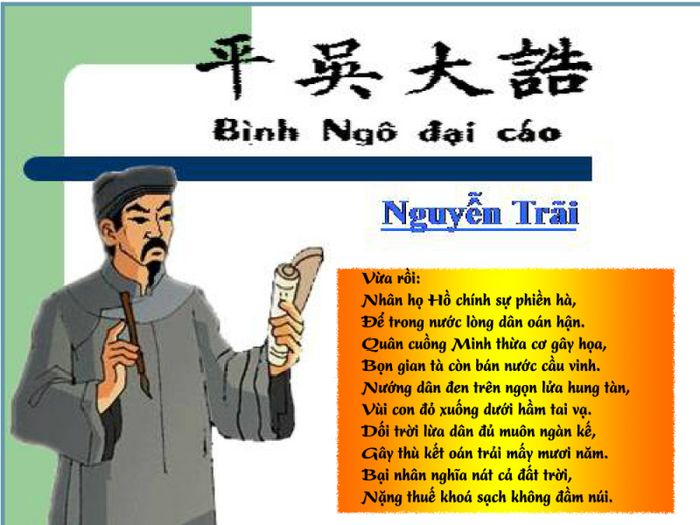 Nguyễn Trãi, một danh nhân vĩ đại của dân tộc Việt Nam, với tình yêu nước cháy bỏng và đóng góp to lớn trong công cuộc bảo vệ đất nước. Tác phẩm nổi tiếng 'Bình Ngô đại cáo' là minh chứng rõ nét nhất cho tâm huyết và tài năng văn chương của ông.