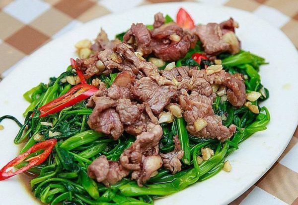 - Cho thịt vào xào nhanh đến khi chín, sau đó thêm rau muống vào xào 1 phút.