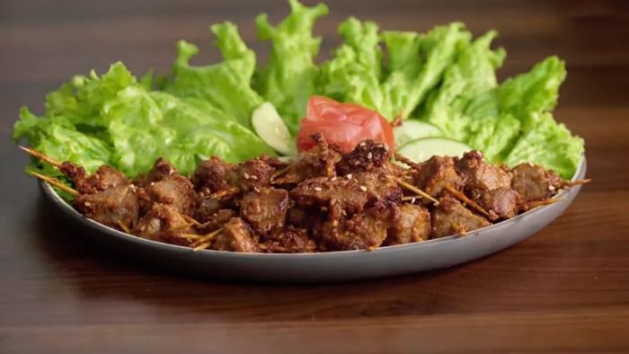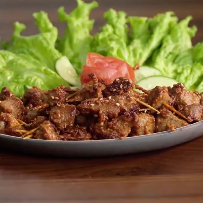 - Xiên thịt bò vào que tre, chiên trong dầu nóng cho đến khi giòn vàng.