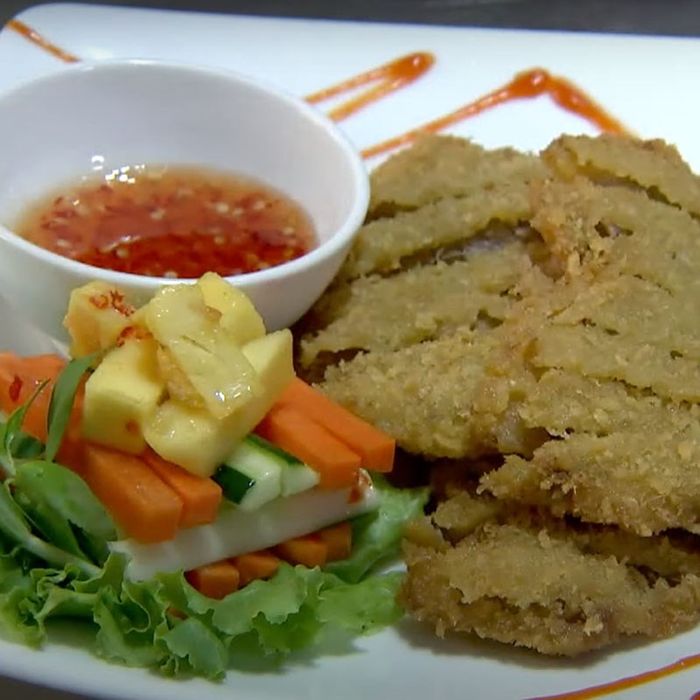 - Bạn cho 200ml dầu lên chảo, khi dầu sôi, bạn nhúng thịt qua bột chiên giòn, sau đó cho bột qua dĩa bột chiên xù, áo bột kín hai mặt thịt rồi cho vào chảo chiên trên lửa lớn từ 5 - 7 phút. Lưu ý lật đều hai mặt để tránh làm phần bột bên ngoài bị khét. Sau đó, vớt thịt ra, để ráo dầu rồi cắt thành từng đoạn nhỏ vừa ăn.