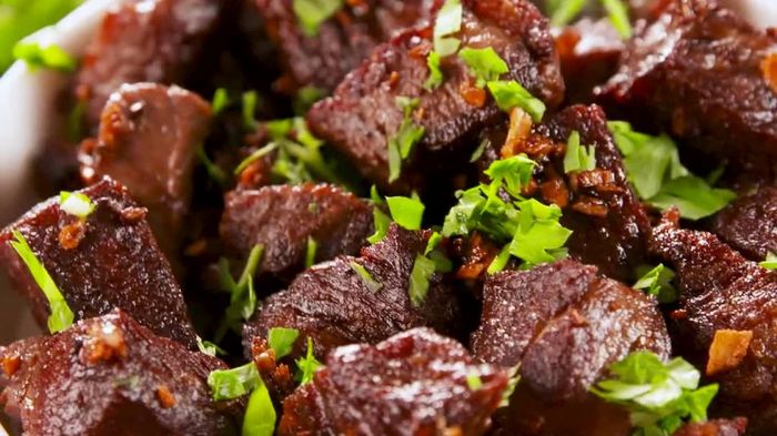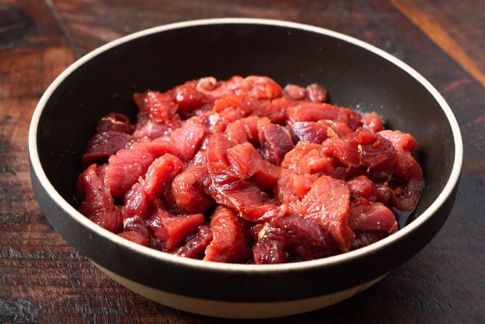 - Dùng dao cắt thịt bò thành các miếng vuông dày khoảng 1 lóng tay.
