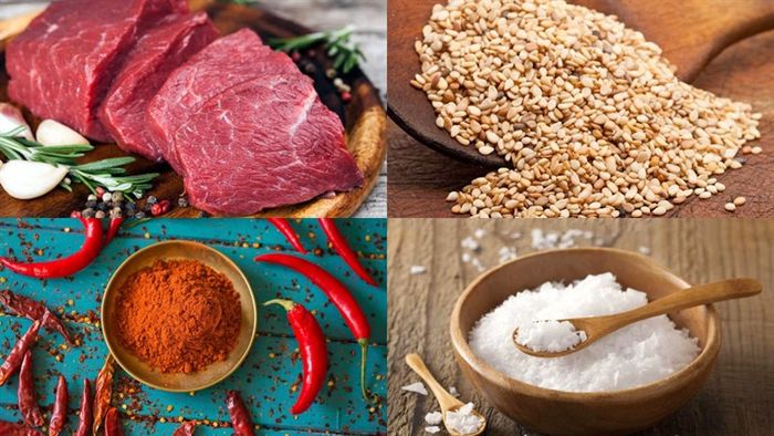 - Sau khi ướp được khoảng 20 phút, bạn cho tiếp vào tô thịt bò 1 muỗng canh bột ớt, 1 muỗng cà phê muối, 1 muỗng cà phê vừng trắng, 1 muỗng cà phê tương ớt. Trộn đều hỗn hợp thêm lần nữa và để thịt nghỉ khoảng 5 phút là được rồi đấy.