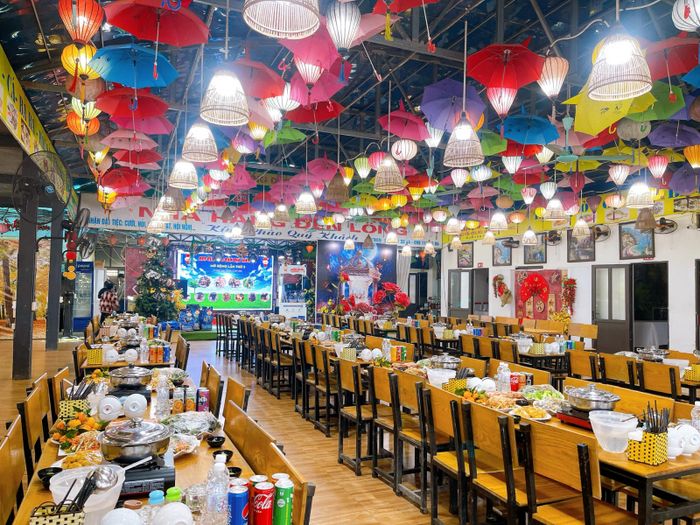 Khi đặt tiệc tại đây, bạn sẽ nhận được combo trang trí tiệc miễn phí. Menu lẩu đa dạng với các loại lẩu như hải sản, riêu cua bắp bò, gà ta, ếch... Mỗi loại nước dùng mang hương vị đặc trưng, từ lẩu hải sản thanh ngọt, chua cay đến lẩu riêu cua thơm ngon, ngọt tự nhiên.