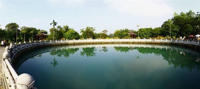 Giếng có hình mặt nguyệt với đường kính 30 m, độ sâu 6 m, nước trong veo phản ánh bức bình minh và bình minh trên bầu trời. Điều đặc biệt là giếng không bao giờ cạn nước. Lan can đá vôi bao quanh miệng giếng tạo nên một khung cảnh tuyệt vời. Khu đất xung quanh giếng hình vuông rộng 0,6 ha, với 4 góc là 4 lầu bát giác. Quanh năm, cây cỏ xanh tốt và hoa nở rực rỡ.