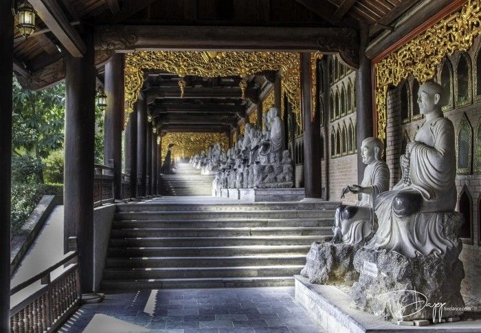 Đi trong dãy hành lang La Hán với tổng chiều dài gần 3 km, du khách sẽ được chiêm ngưỡng với số lượng lớn các pho tượng La Hán. Mỗi dãy hành lang đặt 250 pho tượng La Hán tạc bằng đá nguyên khối, mỗi tượng cao từ 2 đến 2,5 m. Điều đặc biệt thể hiện bàn tay chế tác tài hoa của người thợ đá Ninh Bình chính là mỗi pho tượng có hình dáng và thần thái khác nhau thể hiện triết lý đạo giáo với những cung bậc cảm xúc hỷ, nộ, ái, ố trong đời sống thường nhật của con người. Chính vì vậy, chùa Bái Đính đang giữ kỉ lục là khu chùa có nhiều tượng La Hán nhất Việt Nam.