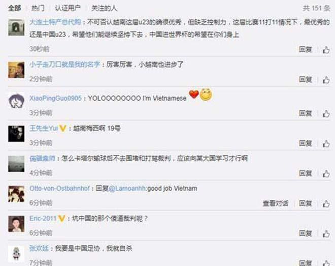 1. Cộng đồng Trung Quốc phản ánh sau chiến thắng của U23 Việt Nam trước U23 Qatar (dịch trên mạng xã hội Webibo của Trung Quốc)