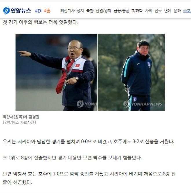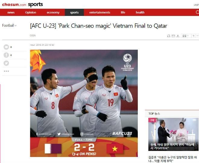 Chiến công lịch sử của HLV Park Hang Seo và Đội tuyển U23 Việt Nam chỉ xuất hiện trong vài giờ trước trận bán kết giữa U23 Hàn Quốc và U23 Uzbekistan. Thậm chí, giới truyền thông Hàn Quốc tỏ ra vô cùng tự tin vào khả năng tái ngộ với U23 Việt Nam ở trận chung kết. Tuy nhiên, thất bại đậm 1-4 của đội tuyển Hàn Quốc khiến kế hoạch này đi vào ngõ cụt.Nhanh chóng, HLV Park Hang Seo trở thành tâm điểm của sự chú ý. Hầu hết các trang báo hàng đầu tại Hàn Quốc đặt những lời khen ngợi nhất cho chiến lược gia 60 tuổi:'Việt Nam vào chung kết nhờ phép màu của Park Hang Seo', tờ Korea Times.'Park Hang Seo - người viết nên lịch sử cho bóng đá Việt Nam', tờ Chosun.Trong quá khứ, HLV Park Hang Seo từng trải qua thất bại khi dẫn dắt U23 Hàn Quốc (đạt huy chương đồng tại ASIAD 2002). Tuy nhiên, thành công của ông với bóng đá Việt Nam đã làm thay đổi hoàn toàn cái nhìn của báo giới Hàn Quốc về ông.Tờ Yonhap News đã viết bài so sánh giữa U23 Việt Nam và U23 Hàn Quốc, cũng như so sánh giữa HLV Park Hang Seo và đồng nghiệp Kim Bong Gil từ U23 Hàn Quốc:'U23 Việt Nam đã từng thất bại trước U23 Hàn Quốc, nhưng họ đã làm được điều mà chúng ta không làm được. HLV Park Hang Seo một lần nữa tạo nên điều kỳ diệu, trong khi Kim Bong Gil thì không. Chúng ta đặt niềm tin vào khả năng gặp lại U23 Việt Nam ở chung kết'.