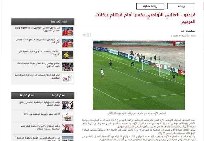 Tờ Alarab đưa tin với tiêu đề rực rỡ: 'Olympic Qatar chấp nhận thất bại trước U23 Việt Nam ở loạt đá luân lưu'. Phóng viên Changju-Qena của Alareb ca ngợi U23 Việt Nam là đội tuyển 'quả cảm, đầy tham vọng và xứng đáng bước tiến vào trận chung kết'. Sự kiện diễn ra vào phút 87 khiến người xem nhớ mãi về lòng kiên trì và quyết tâm của thầy trò Park Hang Seo, đặc biệt là Quang Hải và đồng đội.