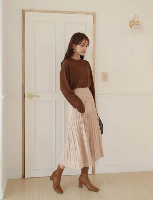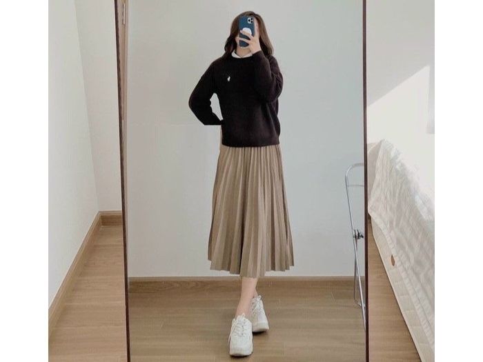 Đối với những cô nàng theo đuổi phong cách ngọt ngào và đằm thắm, chân váy xếp ly là item không thể thiếu. Sự kết hợp giữa áo len tay dài và chân váy xếp ly là một trong những cách phối đồ mùa đông đẹp nhất cho các nàng nấm lùn. Bạn sẽ tỏa sáng và tạo điểm nhấn cho phong cách của mình với set đồ này.