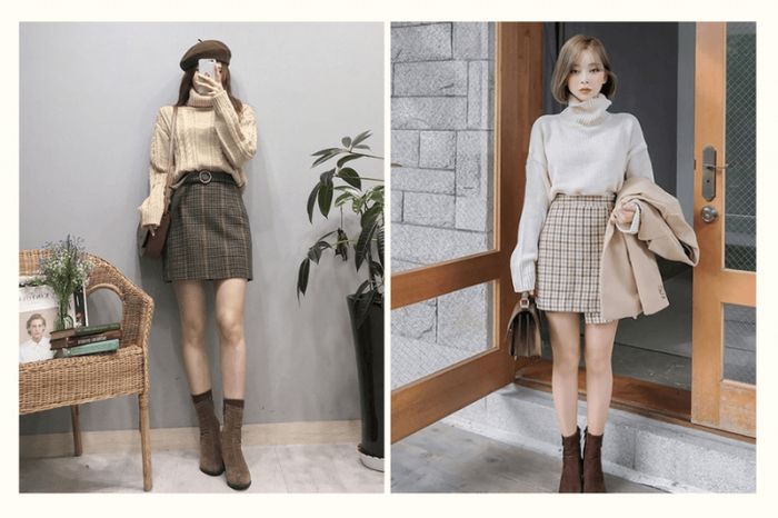 Outfit này đơn giản nhưng lại mang đến sự thanh lịch và trẻ trung, năng động. Chiếc chân váy ngắn form chữ A là nguyên tắc hàng đầu giúp cô nàng nấm lùn có đôi chân dài hơn. Để làm ấm áp hơn trong mùa đông, bạn có thể kết hợp áo cổ lọ với áo khoác, khăn choàng hay giày sneaker nhé.