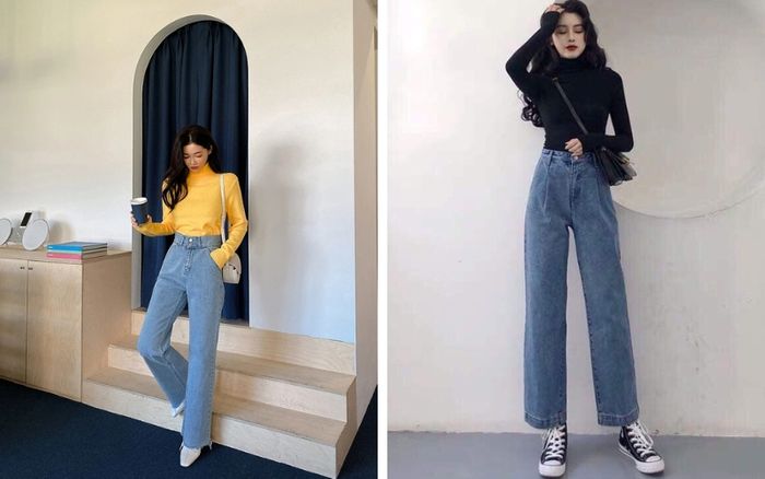 1. Bộ đồ áo cổ lọ và quần jeans cạp cao