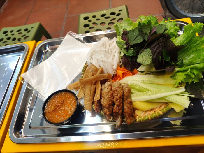 Mẹt Nem Nướng Nha Trang & Bánh Mì Hân Nguyên đầy ú ụ chắc chắn làm siêu lòng mọi tín đồ ăn vặt. Hương vị đậm đà của miếng nem nướng quyện trong vị thanh mát của rau xanh, dưa chuột đem đến trải nghiệm ăn uống độc đáo, mới mẻ cho khách hàng. Quán sở hữu công thức pha chế nước chấm độc quyền, nước chấm không những thơm lại còn cay cay, mặn mặn rất hài hòa. Từ nem nướng, chả ram, rau sống, bánh tráng,... loại nào cũng được nhân viên quán chăm chút tỉ mẩn, bày biện một cách sang trọng, thân thương trên mẹt tre.
