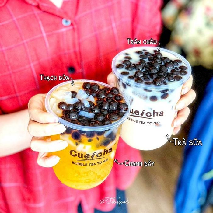 Cueicha in District 7 offers a variety of popular bubble tea options, including banana milk tea, black sugar cheese milk tea, tam bao milk tea, and roasted rice milk tea. The drinks are crafted with care, providing a sweet, creamy taste and chewy tapioca pearls.